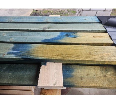 доска была обработана заранее и высушена. Однако это не помешало окислится металлическим опорам с цинковым покрытием. В инструкции сказано только про никелированные изделия. При второй и третьей обработке впитывается заметно меньше и древесина приобретает тёмный зелёный цвет.