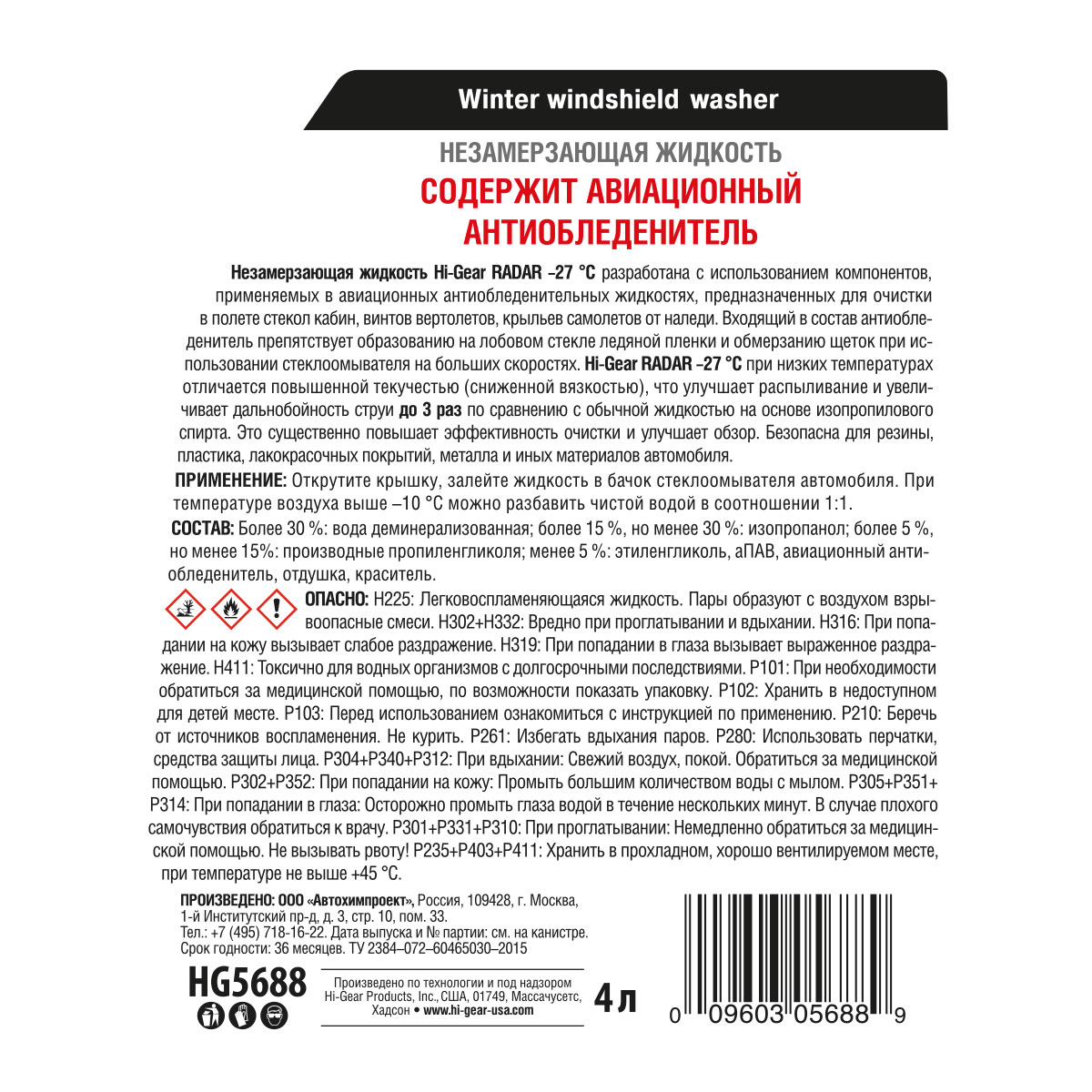 Зимняя незамерзающая жидкость -27С, 4 л., Hi-Gear HG5688 RADAR