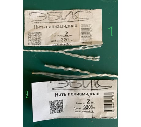 На фото нити из катушек купленных в разное время, №1-январь 2023, №2-апрель 2024. Нить №1 хороша, по структуре, по нагрузке, в использовании, при запаивании обрезанных концов - не распускается, так как структура двух нитей химически одинакова. Нить №2 - пользоваться не возможно, распускается, расходится на две нити, даже при запаивании нити не слепляются между собой, они разной химической структуры. С сомнительным результатом можно попробовать зафиксировать концы узлами. Нагрузку выдерживает. Итог: Получается была куплена нить одной и той же маркировки в разное время, первая хороша, а второй пользоваться очень проблематично, практически не возможно. Производитель не стабилен в производстве этого изделия. К покупке категорически не рекомендую - выброшенные деньги.