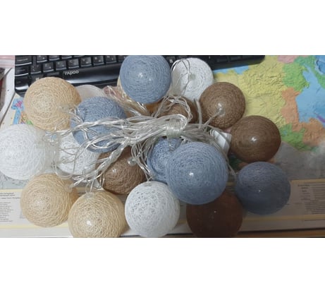 Заказывали, думали, что придет однотонная гирлянда. На самом деле на коробке стоит цвет кремовый, но гилянда состоит из шаров 4 цветов. Не яркая