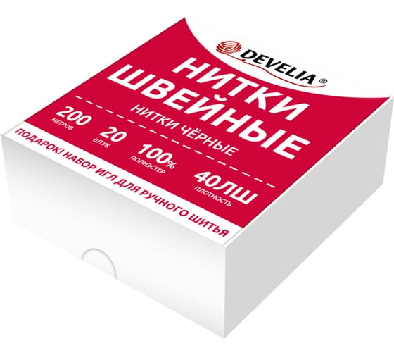 В набор входит 20 катушек 40 ЛШ черного цвета в намотке 200 м и набор игл для ручного шитья (15 штук). Поставляются в картонной коробке.