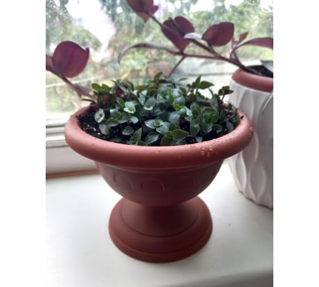 Вазон небольшого размера, как раз подходит для растений у которых небольшая корневая. Обновила каллизию, вазон ей как раз по размеру, т.к. корни маленькие. В этом вазончике она шапкой обрастает, смотрится красиво.