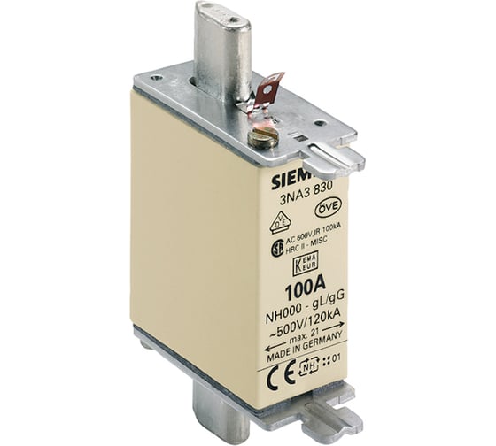 Расходные материалы для низковольтной плавкой вставки Siemens GLGG Типоразмер 00, Iном.100A, Uном.500В 3NA3830