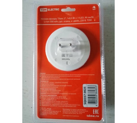 Технические характеристики TDM ELECTRIC Люкс 2 1х0,5 Вт+11LED, 90 лм/Вт, Li-Ion 500 мАч, датчик освещения и движения SQ0357-0025