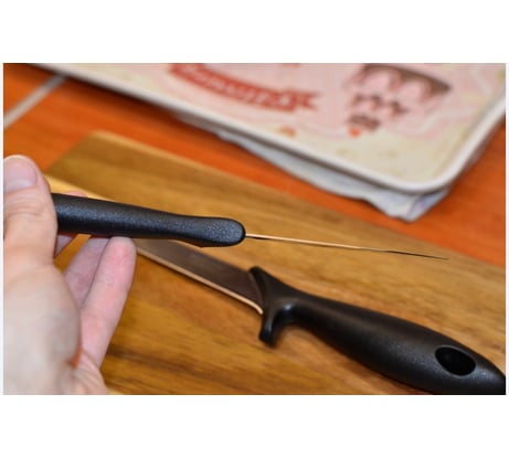 Самый кривой из всех моих марочных ножей (Вустоф, Викторинокс, Аркос, Самуро, Ладомир, Глобал, Фуджи-Тоджиро...), сама кромка косая, завалена, как будто в три захода точили и все время по-разному, но бумагу для принтера и газету режет быстро и ровно. Цена слишком высока. Неудобная блистерно-болдарная упаковка, невозможно глянуть и попробовать перед покупкой, открывать такую упаковку не всегда удобно. Нет информации о марке стали. Сделано в Китае, а не Финляндии.