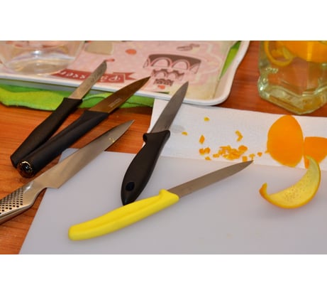 Взял 4 фрутоножика и стал апельсин разделывать, корки чистить и резать для сушки. Так вот из всех этот оказался самым удобным. А кромку и заточку переделаю, когда он наконец-то порядочно подзатупится!