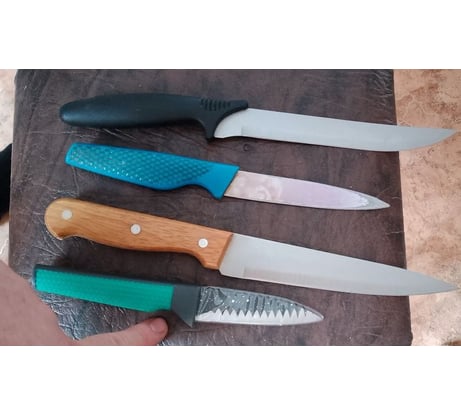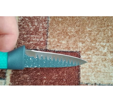 Средний не разрекламированный ножик на кухню за 240 рублей в 2026 году дороговато . Лезвие зигзагом, но заточка ровная (рефленные слайсы\чипсы не нарежет, но и в головке сыра не увязнет). ручка вроде с резиновой вставкой, но вся жесткая и скользкая, пальцевая выемка выражена слабо - ручка почти плоская (возможно соскальзывание указательнного пальца на острие). спуск какбудто филейный\острый, но снята фаска (кромка ощущается как у охотничьего ножа).