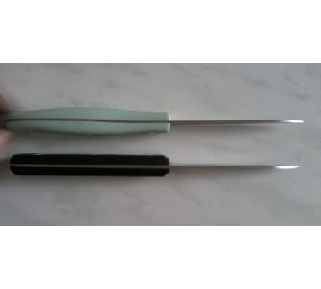 чересчур лёгкий нож, ближе к острию лезвия необходима дополнительная заточка, лучше если бы лезвие было толщиной 1мм, рукоятка "пузатая" и слишком изогнута, лежит в руке не совсем удобно, на границе с лезвием рукоятка не имеет скоса, клёпки выпирают. Нож лежит на поверхности стола почти касаясь остриём, если на столе будет скатерть, то случайным движением можно проткнуть. Кто-то в отзывах сравнил этот нож как аналог Attribute, но это не так, только отдаленное сходство. При одинаковых размерах нож Attribute выигрывает в качестве, удобстве рукоятки и хорошей заточке, а стоит всего на 30 руб дороже. Для сравнения фото.