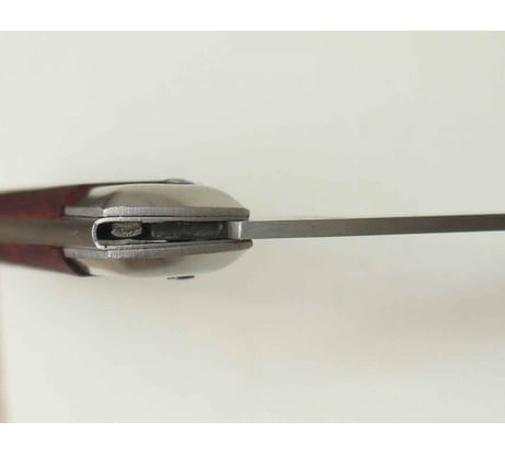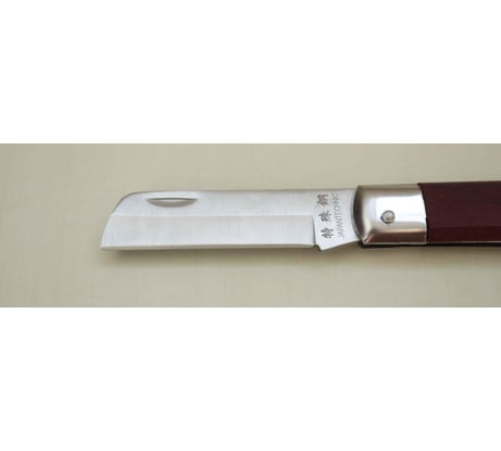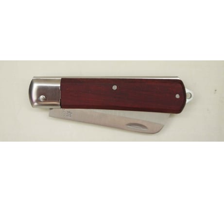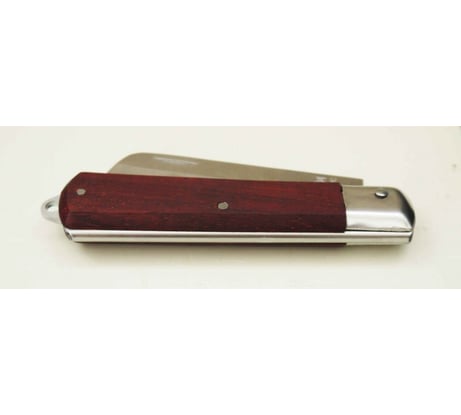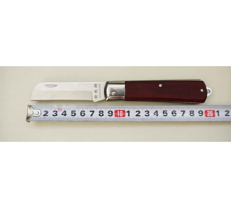 Итак, размеры ножа: Длина в разложенном состоянии – 20см Длина в сложенном состоянии – 11,5см Ширина клинка – 2,2см Толщина клинка у навершия – 2,5мм Толщина рукоятки у притина – 1,3см Толщина рукоятки у навершия – 1,5см Ширина рукоятки у притина – 2,2см Ширина рукоятки у навершия – 2,8см Нож складной, лезвие фиксируется простым и надежным механизмом Slip-Joint (англ. – скользящее соединение). Это один из самых простых типов замков — в крайних положениях клинок удерживается пластинчатой пружиной. Клинок нашего ножа сделан из нержавеющей стали и имеет вогнутые спуски (так называемая доловая заточка), что позволяет легко делать точные и не глубокие резы – самое то, что доктор прописал при работе с кабельной оболочкой! Обух клинка имеет достаточную толщину — 2,5мм. Такая толщина обуха, вкупе с доловой заточкой делает клинок очень прочным и позволяет длительное время сохранять остроту лезвия. Но при этом не стоит использовать лезвие в качестве рычага или отвертки – есть риск серьезно повредить клинок или получить травму. Общее впечатление от клинка очень положительное, видимо не случайно там есть надпись – JAPANTECHNIC. Рукоятка ножа выполнена накладным монтажом из древесины неизвестной породы (подозреваю, что это нечто хвойное из России). Обе половинки рукоятки скреплены с металлическим корпусом стальными заклепками. Пи этом производитель не поленился зашлифовать заклепки заподлицо с корпусом. В навершии рукояти предусмотрено отверстие под темляк. Конечно, рукоятка сделана не аккуратно (и это видно по фотографиям), но за свою низкую цену это очень достойное исполнение. Кроме того, в цехах и на производстве, как правило, не до эстетики, тут на первое место выходит надежность инструмента. А с надежностью у этого ножа все на весьма высоком уровне. Собран нож простенько, но прочно и без люфтов. Кроме того, на рукоятке даже имеется стальной притин (парная накладка), предохраняющий передний торец рукоятки от повреждений. А такую деталь не на каждом «именитом» ноже встретишь!