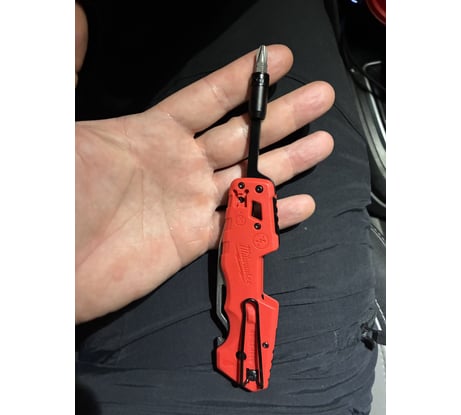 - Складной нож оснащен раскладным держателем для бит ¼″Hex, а также двусторонней битой PH2 и SL5.5