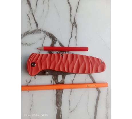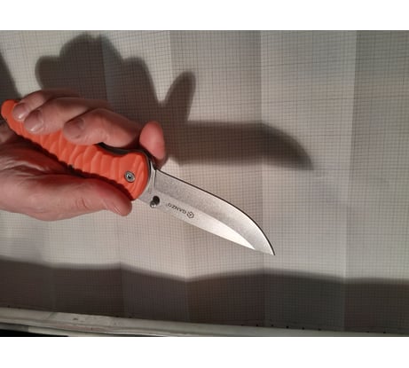 Не плохой нож за свои деньги. То-что "Острая рукоять" преувеличение. из коробки требует смазки и протяжки. К недостаткам могу отнести выемку под палец там-где шпенёк для открытия. Для того чтобы привычно открывать большим пальцем маловата. И цвет скорее розовый, чем оранжевый.