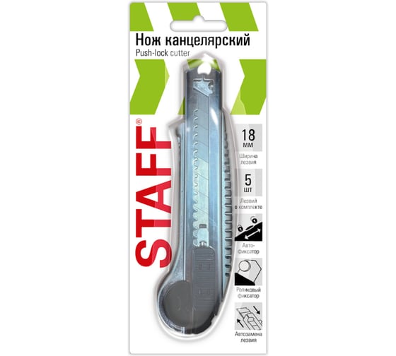 Канцелярский нож STAFF – универсальный, удобный и простой инструмент, который применяется во многих сферах: на складе, в офисе, строительстве, производстве, творчестве и дома. Предназначен для резки различных материалов разной плотности и толщины.