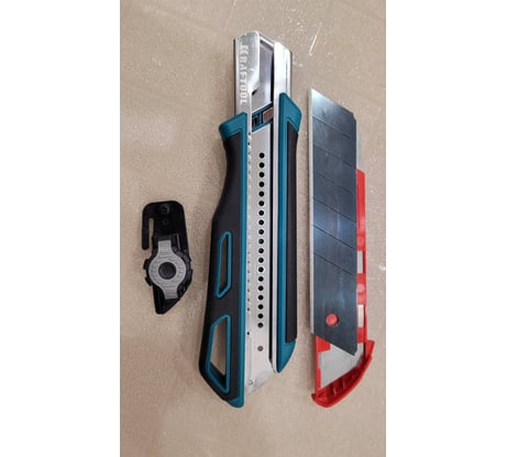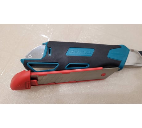 Суровый нож для тяжелых работ! Качество изготовления и конструктив отличные. Корпус крупный и практически весь прорезиненый. Хват удобный, с хорошей фиксацией в руке. Механизм выдвижения и фиксации лезвия продуманный и четко выполняющий свою функцию. Фиксация двойная, за счет зубцов на направляющей и дополнительная резьбовая. Лезвие как у всех ножей имеет небольшой люфт во всех трёх направлениях. Но при фиксациии резьбовым колесом продольный люфт практически исчезает. Торцевая заглушка является пеналом для двух запасных лезвий и имеет хороший фиксатор. Не дешёв но крут! По акции обошёлся в 871₽.