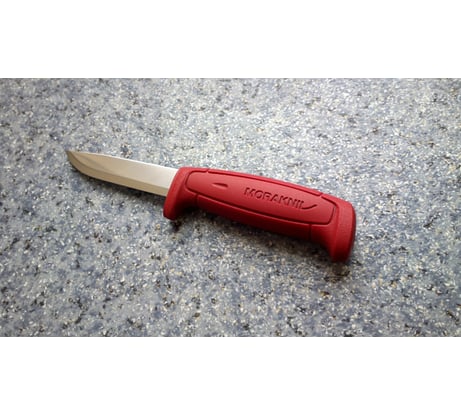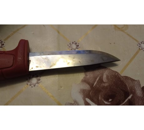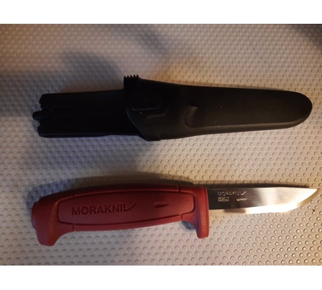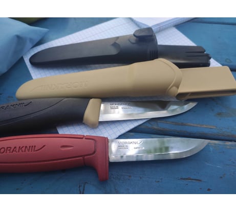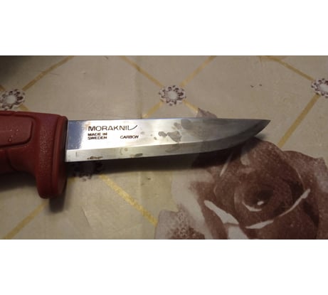Первое впечатление от 511 модели очень хорошее. Очень остро-заточенный полированный клинок со сканди-спусками. Для моей немаленькой ладони удобная рукоять. Получается отличный рез. Исходя из пробы победитом, твердость стали очень приблизительно около 57-58 HRC. Это незначительно выше Моры из нержавейки или почти такая же, только нержавейка sandvik более вязкая из-за легирующих элементов. Имея Мора-Компаньон с нержавеющим клинком, купил на пробу Morakniv basic 511 с клинком из углеродистой стали. Клинок у 511 тоньше и короче компаньона. Различаются рукояти и ножны. Разделывал маринованную в красном соусе курицу для запекания. Работать удобно и эффективно. Заводская заточка отличная, режет легко. После 15 минут разделки помыл и вытер насухо клинок. Но из-за соуса с кислотой возникло небольшое окисление клинка, появились серые пятна. Поэтому сделал выводы, что не стоит этим ножом резать кислото-содержащие продукты, такие как помидоры, цитрусовые, клубнику, киви и т.п. Теперь минусы. У этого ножа ножны гораздо хуже, чем у компаньона. Защелкивается нож в них не так четко и туго. И самое отвратительное — это выступ с лицевой стороны, такое крепление для второго ножа вместе с этим. Спилил этот выступ на второй день. Он постоянно мешается и цепляется за все. На рукояти передний выступ типа гарды слишком большой и в некоторых случаях мешает резать с большим наклоном ножа к плоскости. Думаю позже его частично спилить примерно на 7мм. У клинка имеется три минуса: 1. Формирование клинка к самому кончику (слесарка) сделана неровно и с небольшим бугорком-выступом со стороны обуха. При этом к самому кончику спуски сходятся несимметрично. Хотя вдоль лезвия они ровные и одинаковые. 2. Обух совсем не обработан после штамповки из листового металла. Он весь неровный и выглядит нехорошо. Выровнял и отшлифовал его алмазным бруском. 3. Клинок быстро окисляется. Этот минус был известен до покупки и полностью предсказуем, но все же он есть. Нужно ухаживать за ножом. Попользовался, помыл и вытер насухо клинок. Перед походом, выездом в лес, где влажные условия нужно заранее смазать клинок тонким масла. А так же протирать от влаги и смазывать его в ходе поездки. Зная о всех плюсах и минусах этой модели, рекомендую ее к приобретению.