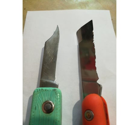 Не понимаю, за что пятерки в отзывах. Из коробки он бумагу, волосы и прочее не режет. Затачивал с одной стороны в клин от обуха. Сталь такую заточку совсем не держит. Для сравнения, состояние ножа, изготовленного в прошлом веке.