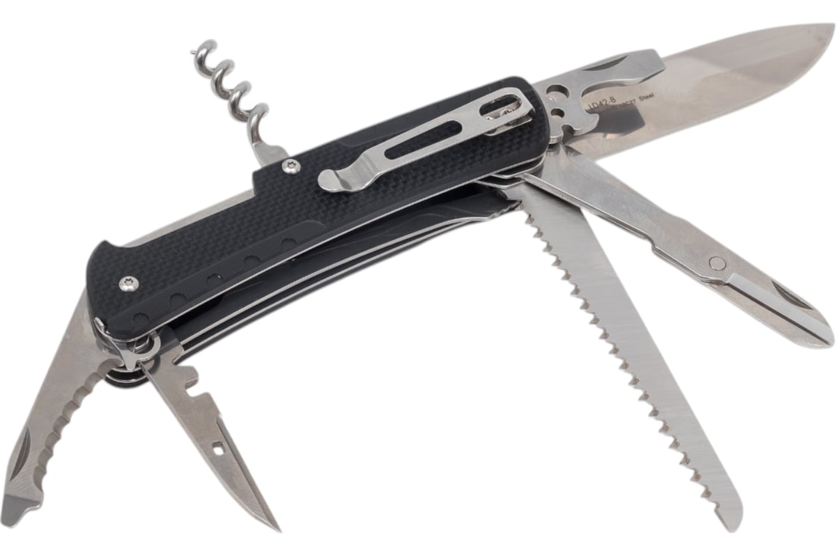 - Нож (длинное лезвие с одноруким открытием, ножницы, инструмент для закручивания проволоки, открывалка для бутылок, большая отвертка 6,5 мм, инструмент для оголения провода, пила по дереву, инструмент для работы с проводом, ключ для велосипедных спиц, отверстие для нитки, скальпель, шило, стропорез, малая отвертка 3 мм, карманная клипса, штопор, стеклобой, кольцо для ключей/темляка, пинцет)
