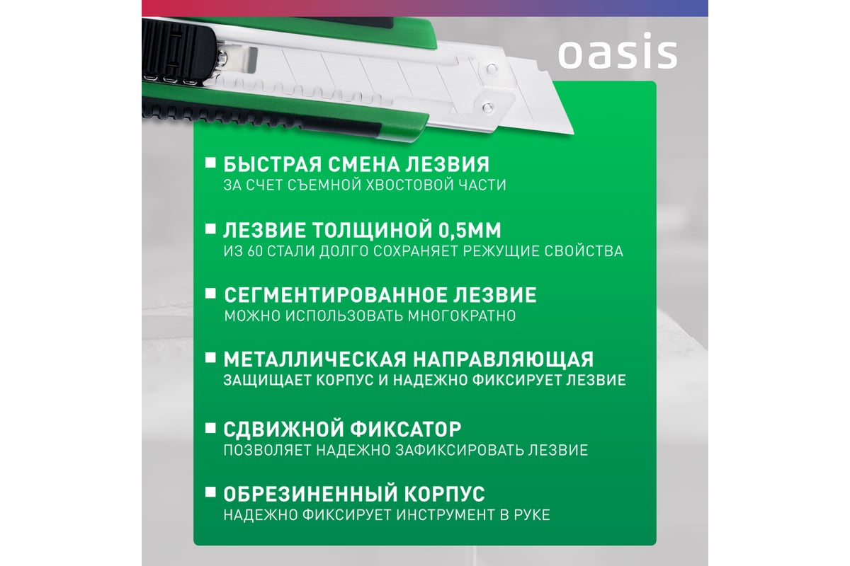 Нож с сегментированным лезвием Oasis Eco 1030601004 — это вид ножа, который используется для резки бумаги, картона, пластика и других подобных материалов. Сегментированное лезвие допускает многократное использование: достаточно отломить изношенный сегмент и можно продолжать работу с острым лезвием.