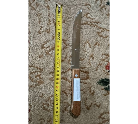 Металл клинка отполирован очень неплохо. Металл упругий. Заточка ровная, приличная - режет очень хорошо. Деревянная рукоять. Форма и размеры удобные.