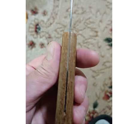 Хвостовик клинка всажен в рукоять, особенно в верхней части рукояти, не совсем ровно (смотри фото), хотя линия клинка и рукояти не нарушена.
