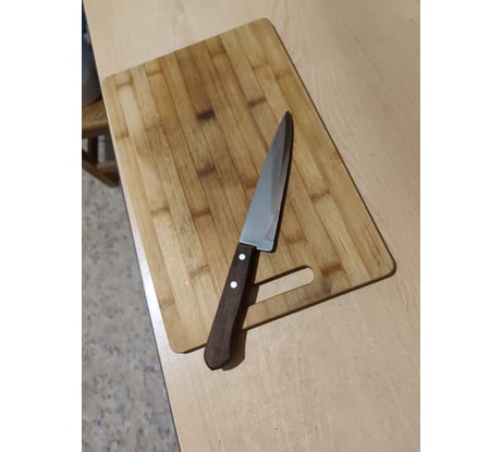 Простой, без всяких наворотов. Не тонкий и не толстый, а такой как нужно, достаточно широкий. Ручка бамбуковая - отличный материал для кухни, ничего не боится и приятно, что не пластиковая. Универсальный, я им все делаю. Есть только отдельный маленький ножик для чистки овощей, а в остальном все удобно делать этим ножом у него хорошая форма лезвия. Ни разу не точил, правлю муссатом и радуюсь жизни. На фото ножу пять лет если что.