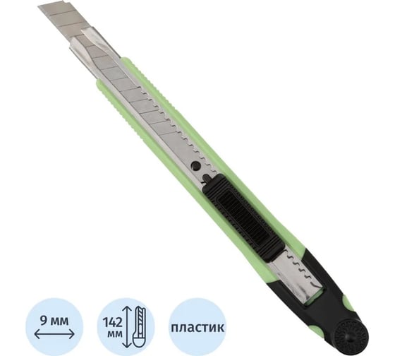 Нож универсальный Attache 9 мм, пластиковый, металлические направляющие, зеленый авто 24шт/уп 2175553