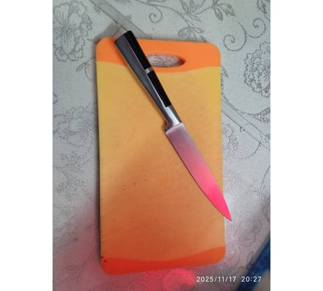 Очень острый нож с хорошим дизайном. Прекрасно режет, пока новый. Надеюсь, что прослужит долго. Заказ пришёл точно в срок.