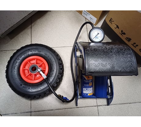 Быстро качает небольшие колеса тачек (на фото колесо до 1,8 АТМ накачал за 14 полных нажатий на педаль), вело колеса. Не требует электричества для работы, что нам и требовалось.