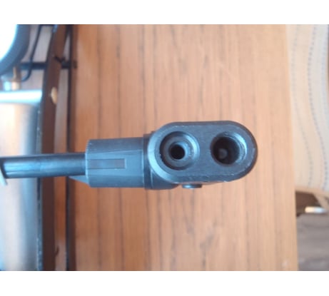Наконечник шланга не удобный и не надёжный. Механизм фиксатора хлипкий. Да и сам шланг не предусмотрен к замене. Пробовал его выкрутить, не получилось - он впресован в квадратную трубку на которой держится манометр. Решил снять и заменить сломанный наконечник другим - металлическим. Чтобы снять, нужно открутить пластиковую "гайку" через которую протянут шланг. Она удерживает шланг на наконечнике и откручивется с трудом - резьба правая.