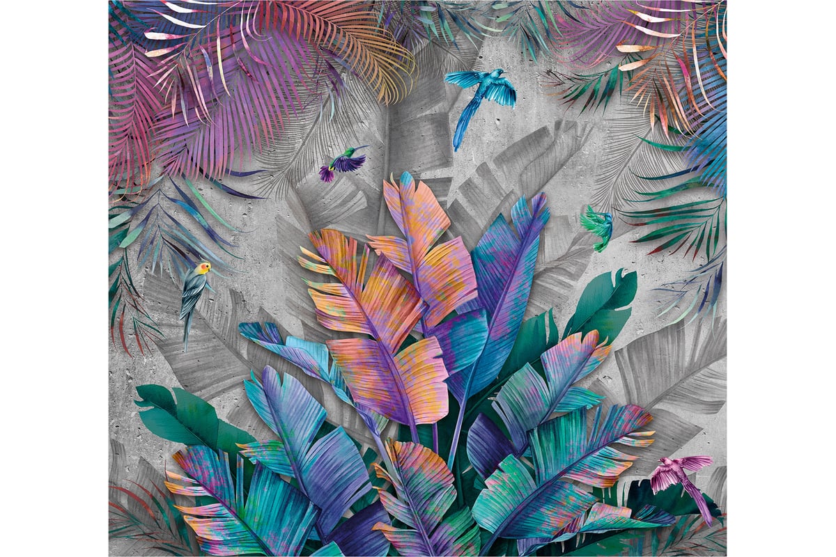 Обои Разноцветные листья и птицы на сером фоне Топ Фотообои флизелин, 300х270 см 26-1031-МF-3 предназначены для поклейки на кухню, в спальню, детскую, зал, гостиную, прихожую.