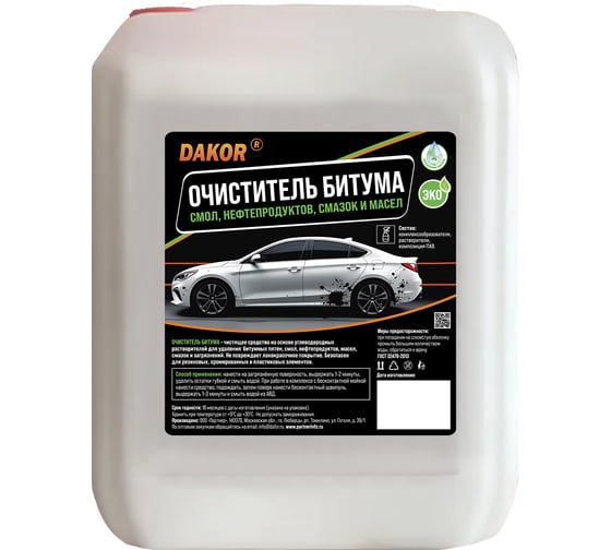 DAKOR Очиститель битума — профессиональное средство для быстрого удаления битумных пятен, смол, нефтепродуктов, масел и смазок с кузова автомобиля и других поверхностей. Эффективно растворяет стойкие дорожные загрязнения, не повреждая лакокрасочное покрытие.