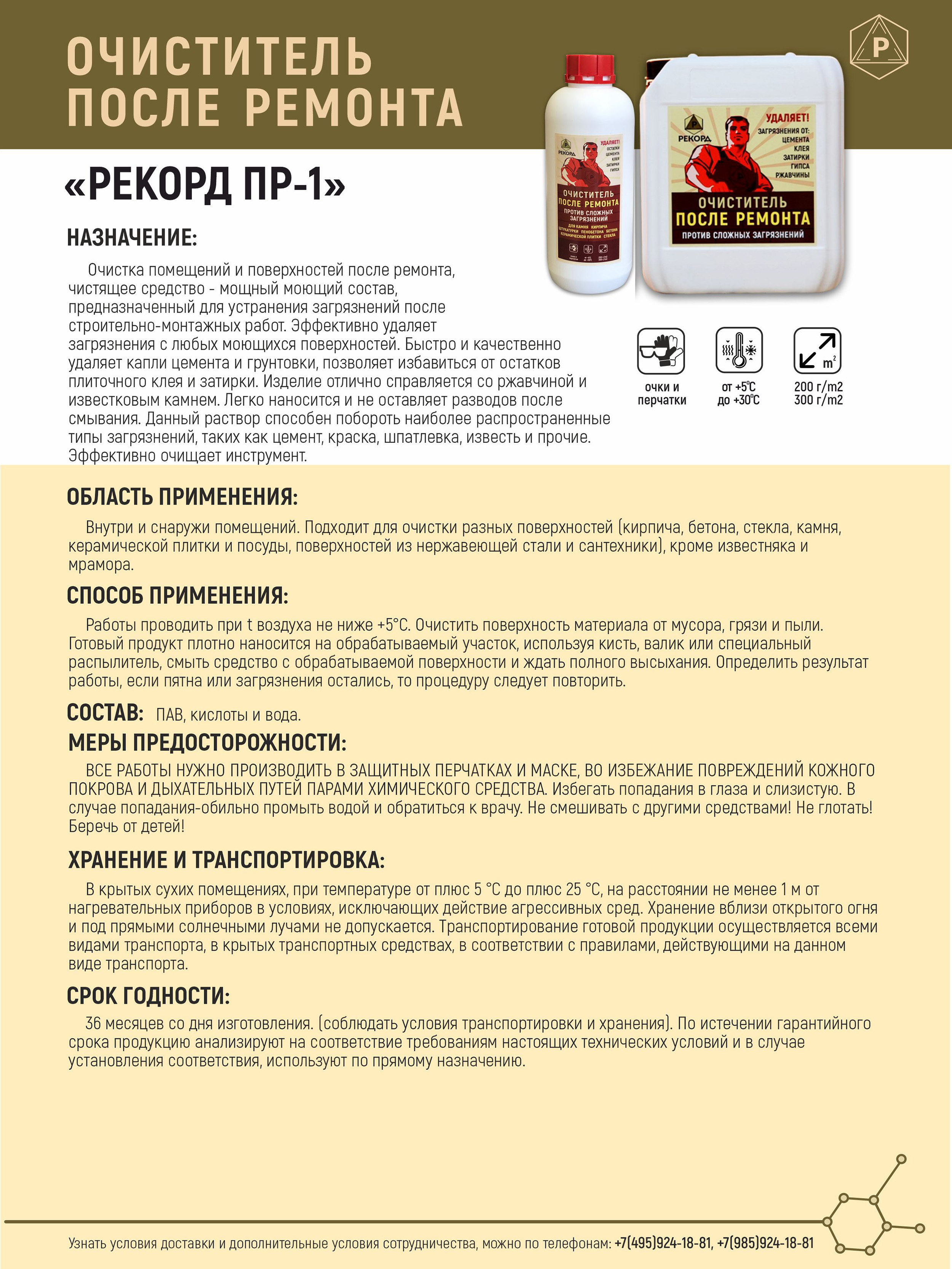 Очиститель после ремонта РЕКОРД 10 л ОП03 эффективно удаляет загрязнения с любых моющихся поверхностей. Быстро и качественно удаляет капли цемента и грунтовки, позволяет избавиться от остатков плиточного клея и затирки. Изделие отлично справляется со ржавчиной и известковым камнем. Легко наносится и не оставляет разводов после смывания. Данный раствор способен побороть наиболее распространенные типы загрязнений, таких как цемент, краска, шпатлевка, известь и прочие. Эффективно очищает инструмент. Эффективно удаляет мелкие загрязнения в виде гипсовой и известковой пыли, отмывает отделочные растворы, поэтому отличается практичностью.