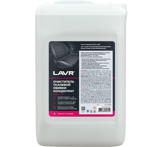 Очиститель тканевой обивки салона Lavr против сложных загрязнений 5л Ln1463 используют для удаления трудновыводимых загрязнений (еда, напитки, машинное масло, табачный налет, дорожная грязь). Продукт освежает и обновляет обивку в салоне автомобиля.