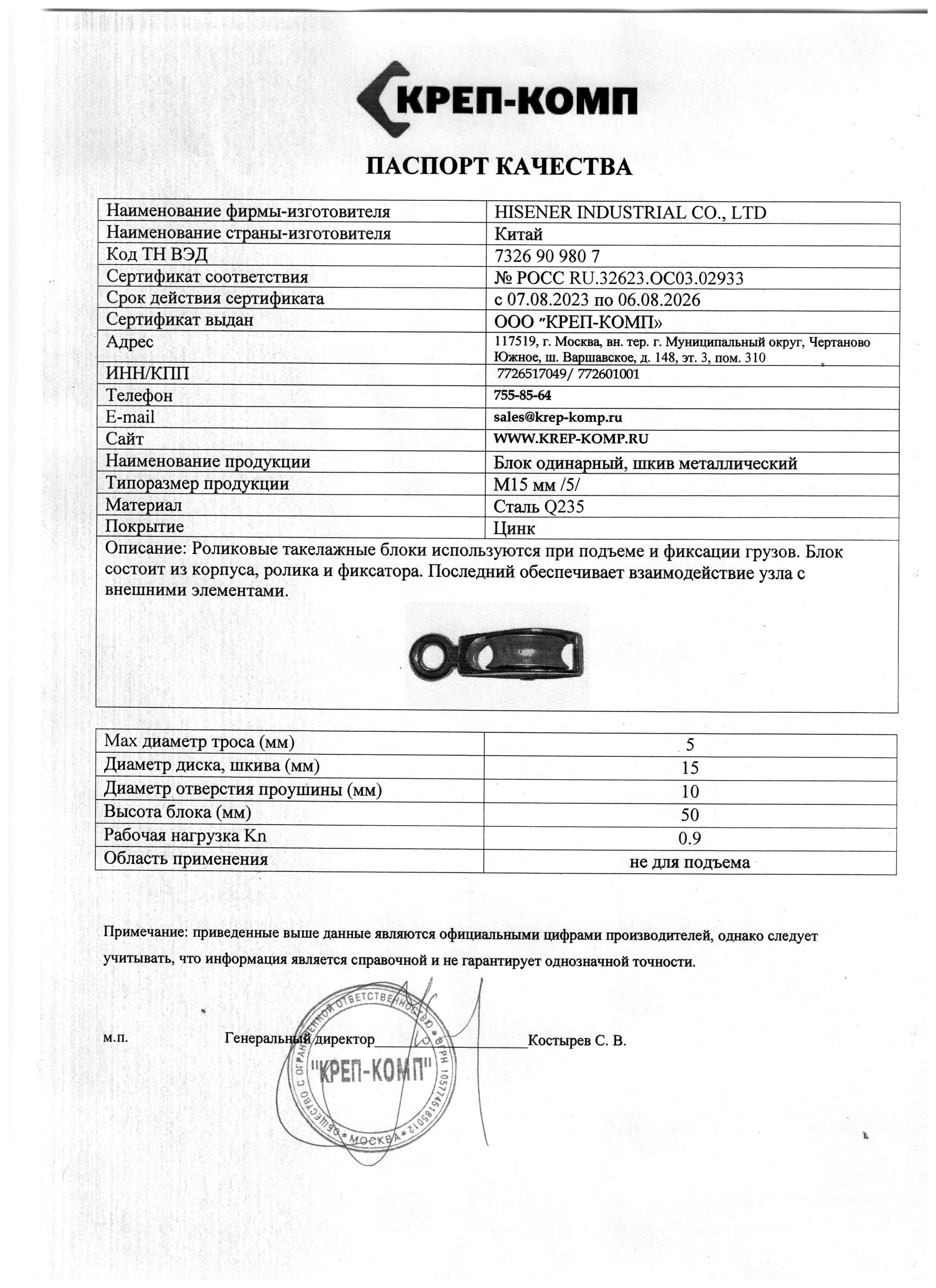 Технические характеристики одинарного блока КРЕП-КОМП шкив металлический 15 миллиметр
