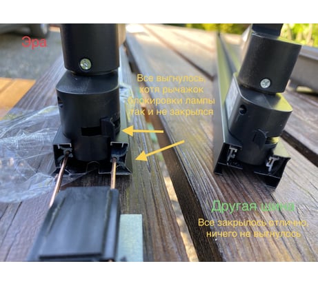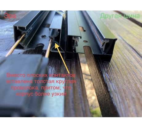 Первый раз в жизни пришлось возвращать вещь, просто потому, что ее нельзя использовать по назначению, вообще никак. Купил шину другой марки 1 метр, оказалась коротковата для моих целей, купил эту Эра 2 метра, думал подрезать. Повелся на низкую цену (эта шина стоила 768р, а двухметровый вариант шины, которую я купил ранее — 1200р). Почитал отзывы, что металл тонкий, ну подумал — ладно. Попытался в нее вставить светильник. Обнаружил, что при попытке закрепить светильник, защелкивая встроенные в него рычажки, хлипкие тонкие борта шины выгибаются, но рычажки блокировки на светильнике все равно не защелкивается, доходят только до половины, и в этой позиции не фиксируются! То есть светильник невозможно зафиксировать в этой шине. Стал разбираться, как так: вместо тонких плоских контактных полосок, как в других шинах, в паз вставлен круглый толстый стержень! А корпус этой шины при этом уже, чем обычно. Контакты толще, корпус уже, из-за чего закрыть лампу невозможно. Помимо этого модуль ввода это не отдельная съемная деталь с подпружиненными контактами, а тупо клеммник, в который проволока зажата винтами, его никак не снять, чтобы провод подключить, к примеру. Ну и еще у этой шины дурацкая форма — не прямоугольная, видимо металл слишком тонкий, и нужна была дополнительная жесткость. Не знаю, как люди это используют, видимо у тех, кто писал отзывы ранее, конструкция была чуть другая. Привожу фото сравнения этой шины Эра, и другой недорогой шины, которая никак не образец качества, но функцию свою выполняет полностью.
