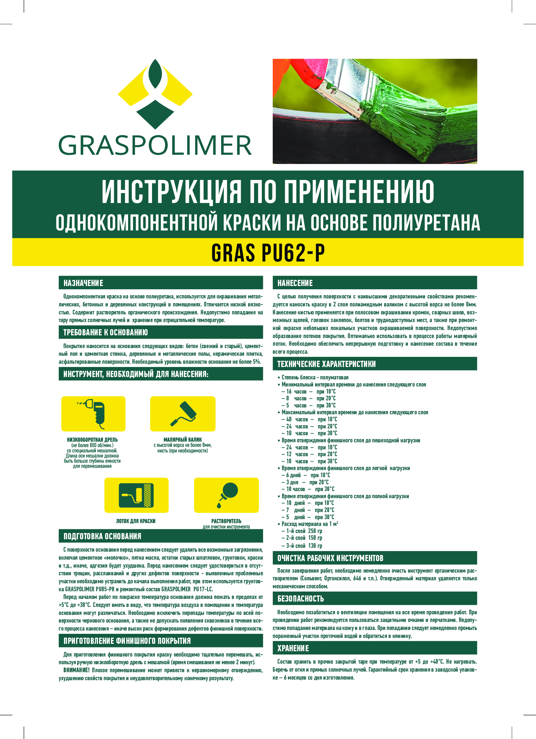 Однокомпонентная полиуретановая краска GRASPOLIMER PU62-P 5 кг цвет белый RAL 9003 280034 предназначена для проведения окрасочных работ в пищевых и фармацевтических цехах, автомастерских, самолетных ангарах и лабораториях.