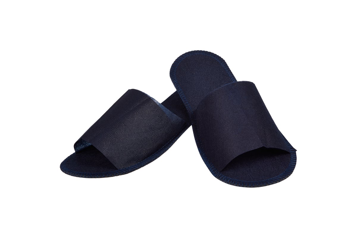 Одноразовые тапочки синего цвета с открытым мысом для гостиничных номеров, а также различных медицинских и косметологических учреждений. Верх из нетканого материала спанбонд плотностью 60 г/кв.м. Подошва: пенополиэтилен 4 мм. Прошивка: оверлок. Имеют универсальный размер: 38-42. Продаются упаковками по 150 пар.