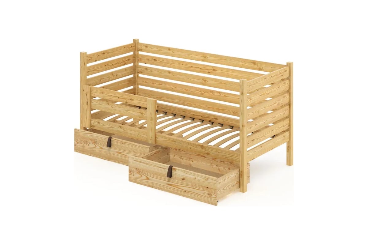 Односпальная кровать Solarius подростковая из массива сосны с ортопедическим основанием и высокими бортиками, 70x180 см (габариты 80x190), с двумя выкатными ящиками, без покраски det-spin70-180-orto-2yash
