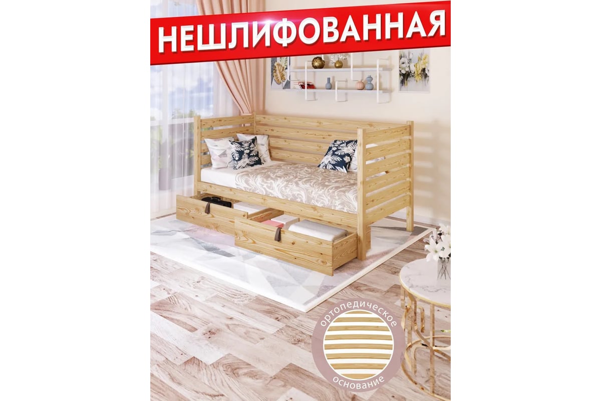 Односпальная тахта Solarius из массива сосны, с ортопедическим основанием и высокими бортиками, 90x180 см, габариты 100x190 см, с двумя выкатными ящиками, розовый tahta-spin90-180roz-orto-2yash