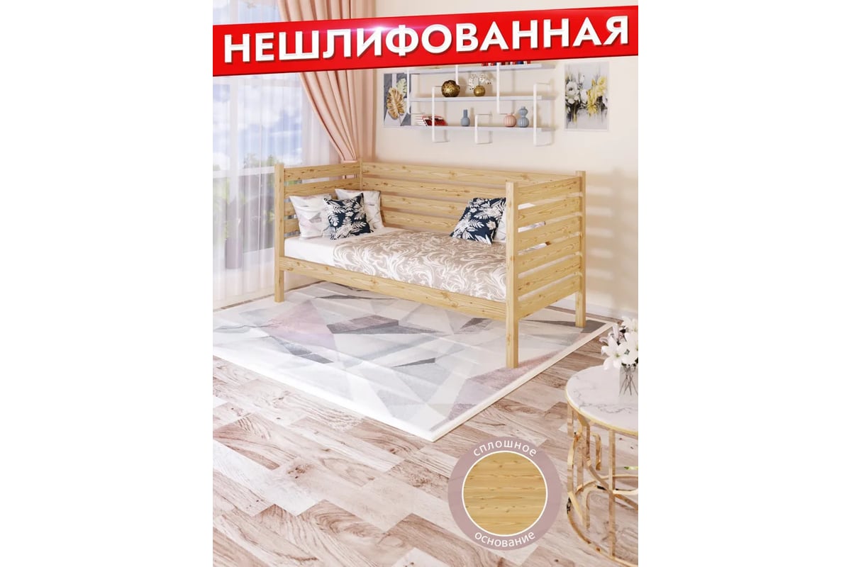 Односпальная тахта Solarius из массива сосны, с реечным основанием и высокими бортиками, 80x180 см, габариты 90x190 см, без шлифовки и покраски tahta-spin80-180net
