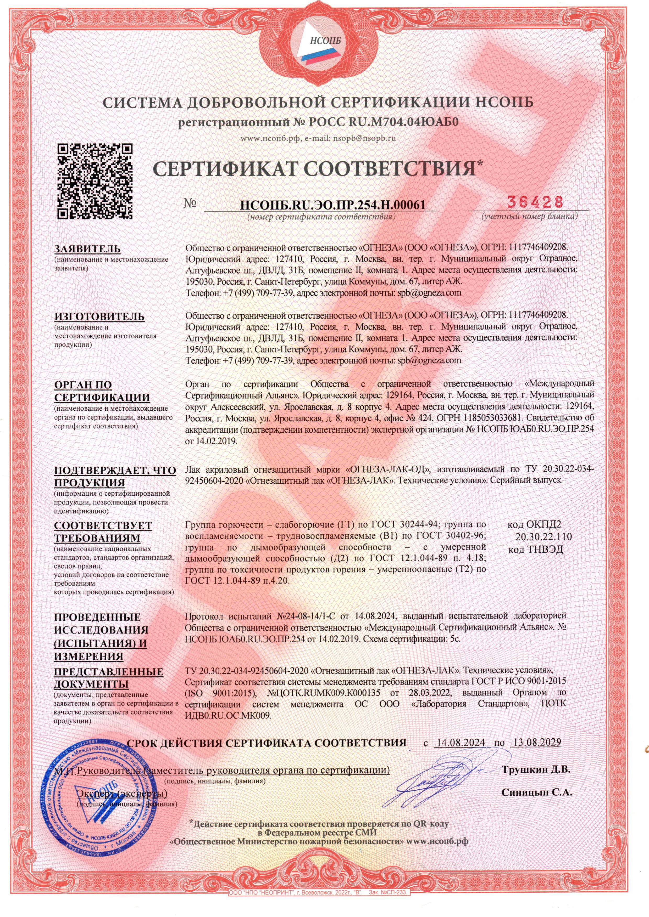 Огнезащитный акриловый лак для древесины и материалов из неё ОГНЕЗА-ЛАК-ОД матовый 105059 изготовлен на органической основе. Используется для защиты от огня изделий и конструкций из древесины, а также минеральных оснований. Обеспечивает класс пожарной опасности КМ2, по горючести относится к группе Г1.