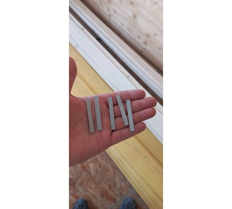 Первый подобный инструмент. Бьет сильно. Крепил хвою имитацию бруса 16 мм гвоздями 50мм Крафтул (тут же покупал). Надо регулировать силу удара, чтобы не слишком утапливались. Очень доволен. Гвозди не зажевывает. Взял аккумулятор на 4 а/ч. После забитых примерно 550 гвоздей на 9 м2 аккумулятор сел на 1 деление светового индикатора. Как тут и писали не добивает 4 гвоздя из обоймы. На фото недтбитки. Пока не пробовал небитые загружать. Про вес. Женской руке будет тяжело. Я офисный работник, особыми физическими данными не отличаюсь. Из спорта: лопата, молоток и прочее. Рука от нейлера не устает.