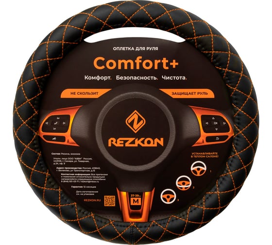 Оплетка для руля REZKON каркасная стандарт экокожа гладкая черный оранжевый ромб мини 8003011720