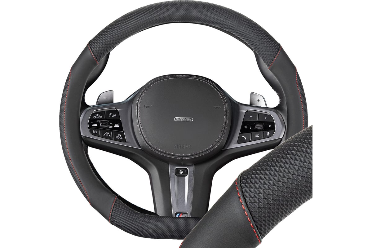 Оплетка D-тип экокожа M (37-39 см) SKYWAY Design Drift-7 Черная, красная строчка - современная классическая оплётка с плоской нижней гранью, скроет имеющиеся потёртости и царапины, предотвратит появление новых. Обеспечивает надёжный контакт ладоней с ободом руля. Оплётка выполнена из высококачественной экокожи и ПВХ которая сохраняет привлекательный внешний вид в течение длительного времени, проста в уходе, износостойкая. За счет многослойной структуры не нагревается при воздействии солнечных лучей, в зимнее время нехолодная на ощупь. Применение инновационных материалов на внутренней стороне оплетки исключает её проскальзывание. Аккуратно выполненные швы - гарантия высокой долговечности.