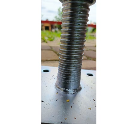 Две опоры из четырех - брак. Резьба у опорной пластины на пяти сантиметрах с недорезанным профилем. Поэтому гайка не опускается до пятки. Токарю двойку за резьбу, сварщику двойку за сварку. ОТК кол за то, что допускает такой товар к продаже. Общая оценка три, хоть две опоры нормальные.