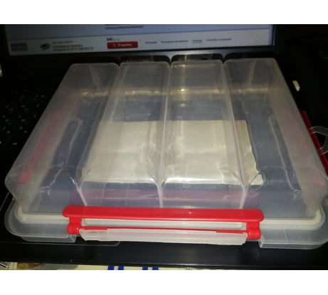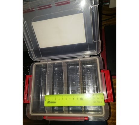 Отличный органайзер.Крышка крепится на петлях,наличие уплотнения предотвращает попадание пыли,влаги во внутрь.Прозрачный пластик корпуса позволяет видеть содержимое органайзера.Три надежных замка.