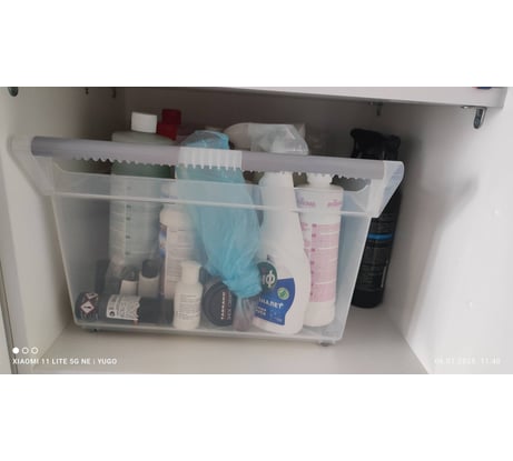 Контейнер на колесиках,точно встал в полку шкафа, храню там всякие средства, так они точно не испачкают шкаф. И не смотря на общую тяжесть за ручку можно легко вытянуть контейнер и достать средство.