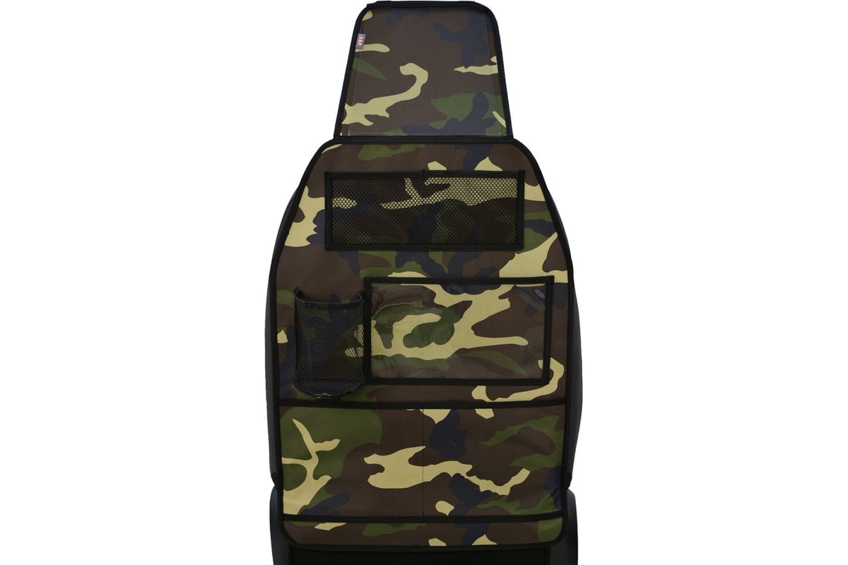 Органайзер на спинку переднего сиденья автомобиля с держателем планшета A&P камуфляж OSPS398 - незаменимый помощник для автомобилистов, путешествующих с детьми. Он не только защищает спинку сиденья от грязной и влажной детской обуви, но и позволяет компактно разместить все необходимое ребенку в поездке. Книжки, альбом, фломастеры, бутылочка с водой, салфетки и планшет с любимыми мультфильмами – все это поместится на спинке сиденья благодаря множеству карманов.