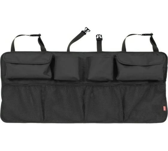 Органайзер на спинку заднего сиденья Tplus 1000x400 мм, оксфорд 600, чёрный T016953 поможет навести порядок в багажнике автомобиля и обеспечит легкий доступ к необходимым вещам. В изделии большое количество карманов и отделений. Два больших кармана с крышкой-клапаном подойдут для хранения инструментов, аптечки, салфеток, перчаток и прочего. Два открытых кармана под хранение различной мелочи. Четыре больших и глубоких отделения из однослойной сетки могут быть использованы для размещения крупногабаритных вещей: канистр, бутылок, строп, ремней и многого другого.