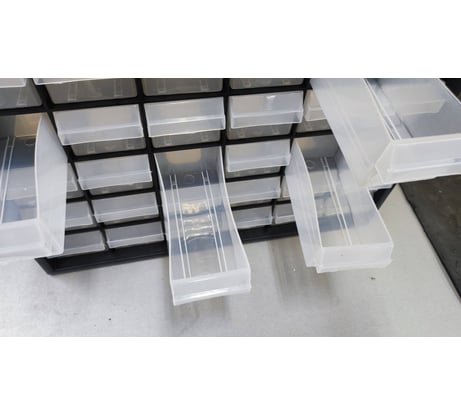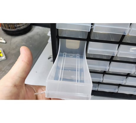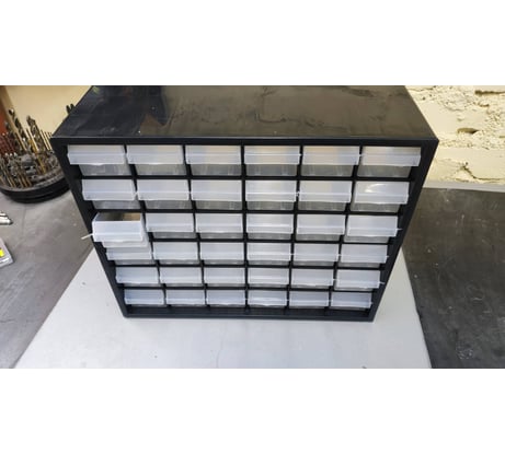 Разместил в ячейках крепёж и прочие мелочи по типам и размерам, а также нанес наименование изделий в каждом ряду для быстрого поиска (см. фото)