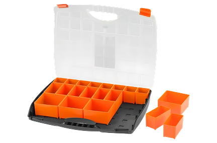 Органайзер с контейнерами Stels 90725 размером 425 х 330 х 60 мм, из пластика, пригодится в хозяйстве и мастерской для хранения крепежных элементов, принадлежностей для рукоделия, снастей и т.д. Он обеспечивает быстрый доступ к предметам, не допуская их перемешивания и утери.